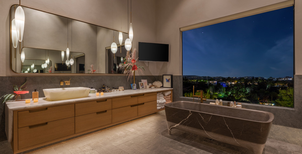 Outside, the entertainment area includes fabulous canyon views from the pool terrace, which has a heated saltwater pool, jacuzzi, chef’s grill and wood-fired oven. A grapevine-shaded pergola is perfect for alfresco dining.
