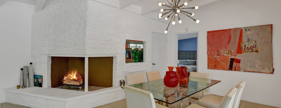 Crisp white walls beg for the display of an art collection and terrazzo floors throughout guarantee a low maintenance lifestyle. Floor-to-ceiling glass walls traverse the back of the house, an angular fireplace can be viewed from the dining and living areas and the large eat-in kitchen is filled with high-end appliances including a wine cooler and duel refrigerators, dishwashers and ovens. Bathrooms are eye-catching with imported tiles and fixtures and the master bath has a walk-in double shower. Furnishings, almost all of which are included in the sale, include top designers of the 20th century such as Milo Baughman and Miles Van der Rohe.