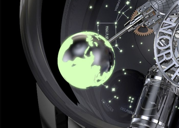 On the second satellite is the 288-facet Jacob-cut diamond, rotating on itself in 60 seconds. On the third satellite, directly across from the tourbillon, is the time display, while on the fourth satellite is the magnesium lacquered globe, which rotates on itself in 60 seconds.