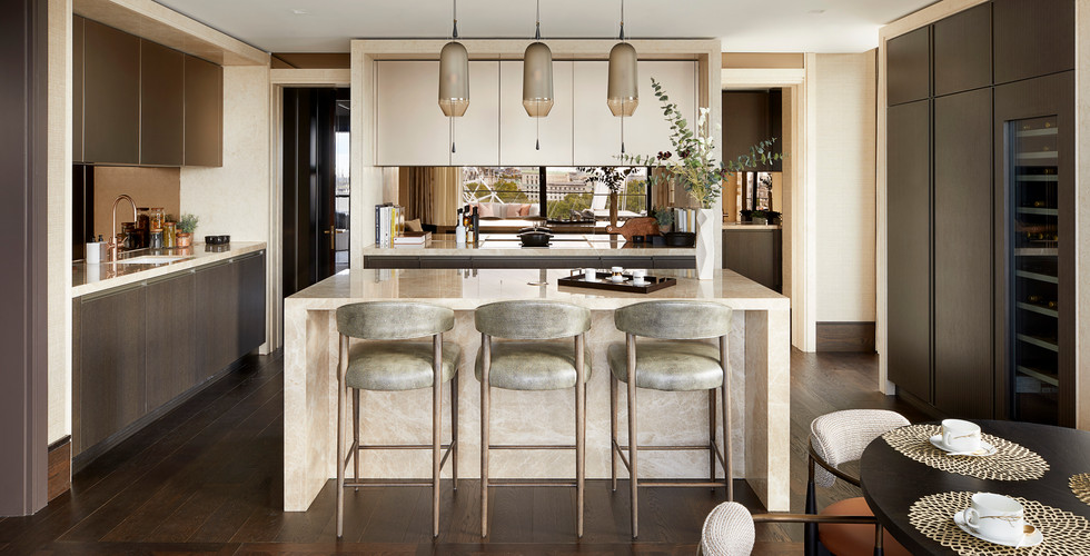 The living/dining area leads onto the main kitchen, which features integrated Miele appliances, a wine cooler, polished marble worktops and a breakfast bar. Due to its position in the building, it provides a direct view of Big Ben through a full-height glazed sliding door - leading onto a private terrace. With this in mind, the arrangement of the kitchen inspired Goddard Littlefair to dress the space without a kitchen clock, seeing no better alternative to the world-famous clockface outside.