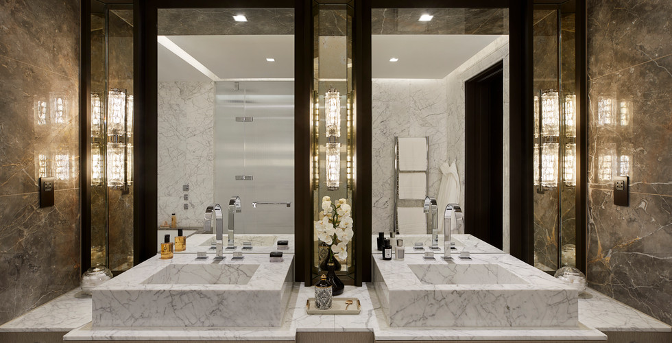 Across the entrance hallway are the two master bedroom suites, which both include spacious walk-in-dressing areas. The principal double-height master, located at the front of the penthouse, includes access to a private balcony, and features an impressive headboard embroidered with glistening and shimmering metallic threads and glass beads.