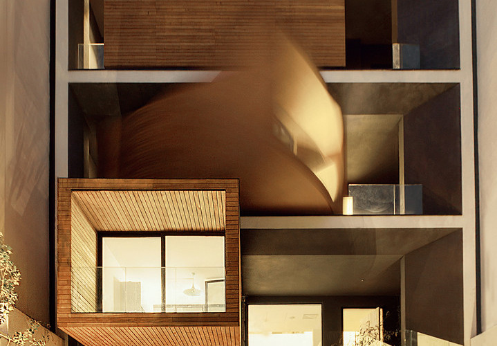 The project consisted of four major parts; the fixed volume of the structure, the void, and the fixed volume and the mobile volume, respectively. When the turning boxes are closed, the building captures sunlight throughout the space of the central void, which also connects the two fixed volumes by suspended bridges.