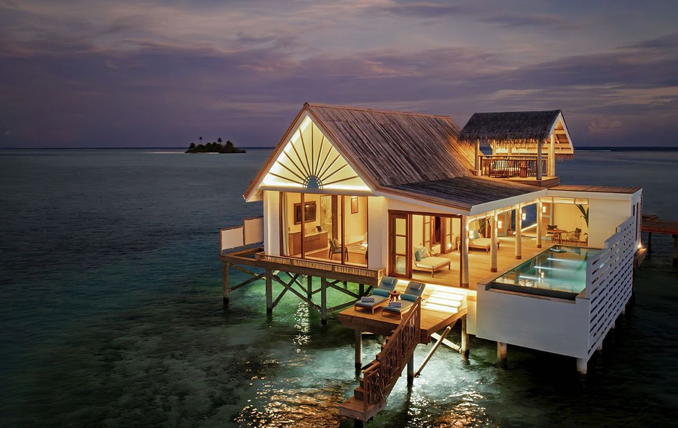 The two-bedroom Family Over-Water Pool Villas are set above the glistening waters of the Indian Ocean and perfectly positioned to capture Maldivian sunsets. Villas feature an expansive indoor-outdoor living space, a private pool, and a playful 18-metre slide leading directly into the ocean.