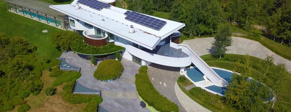 The landscape includes an interesting open, free-form swimming pool at the entrance with stairs from an upper level that appear to go into and below the pool - but in reality exits into the car park and a glass-enclosed, saltwater lap pool with side walls that raise and invite warm summer breezes. The flower, herb and vegetable garden beds are designed in a formal pattern that encourage leisurely strolls among the blooms. The house comes with its very own beekeeper to look after the honey bees. Power sources for the property come from generators, solar and geothermal systems making it completely self-sustaining.