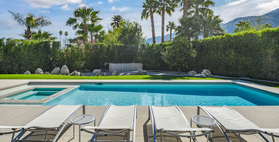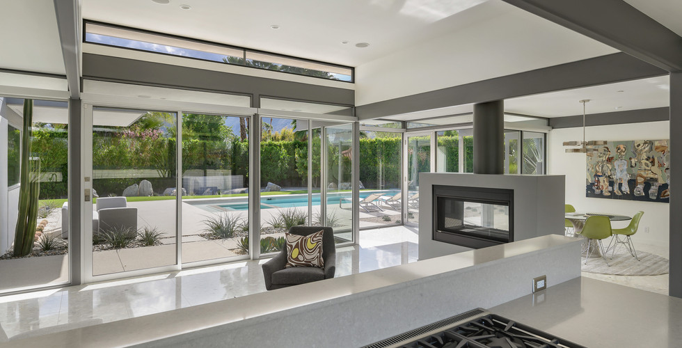 Also outside is a 45-foot, salt-water swimming pool, spa and outdoor shower off the master suite. Views from the interior’s glass walls and the pool terrace are 360 degrees of mountains ensuring an impressive backdrop. The 1950’s vibe is shown in the galley kitchen, though more open to the great room, the double-sided fireplace and polished concrete floors. Stepping into today are the current high-end finishes, fixtures, remotely operated window shades and security system. Additional amenities include a large laundry room/butler’s pantry and sound system. There is also an attached two-car garage.