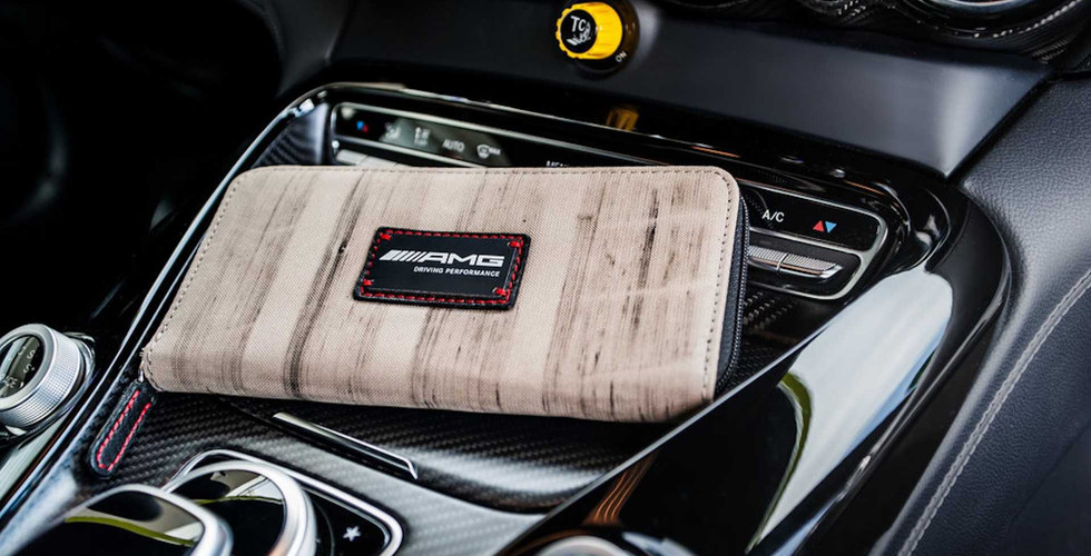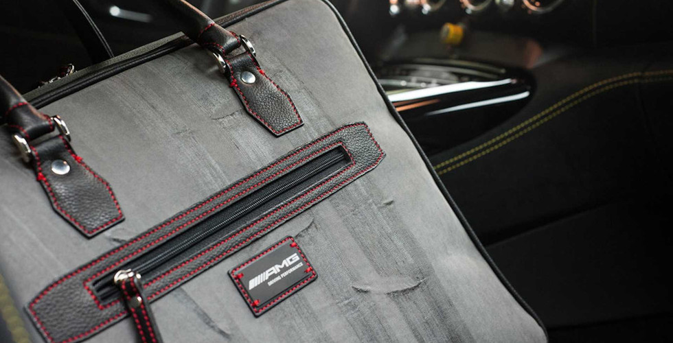 To ensure this collection stand out in an already over saturated market the bags are made with fabric that’s been purposefully ran over and marked by the tires of a sports car. To create this special tyre effect motif neutral-colored fabric was placed on the racing track where it is made to undergo some high-octane treatment under the wide tires of the AMG GT R.