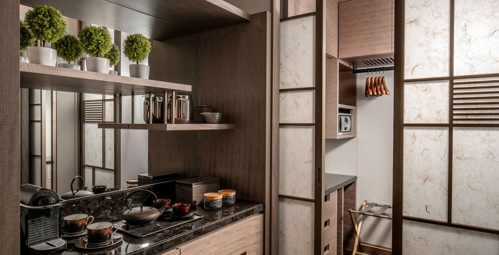 All rooms and suites are tailored for intimacy with an innovative open-plan layout. The sophisticated Japanese aesthetic flows through the interiors which are illuminated by natural light during the day and with bespoke modern light fixtures to reflect the after-dark glamour of Tokyo.