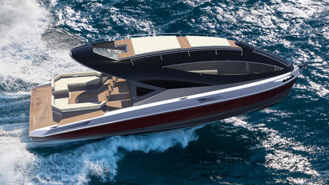 Inspired by the futuristic lines a spaceship which characterized the brands Jet Capsule model the new water vehicle adopts a sleek, carbon fiber structure which is fully customizable . Measuring 33 feet in length, the cruiser is available as either a traditional motor-powered yacht or as a futuristic foiling vessel providing the element of flying over the water.